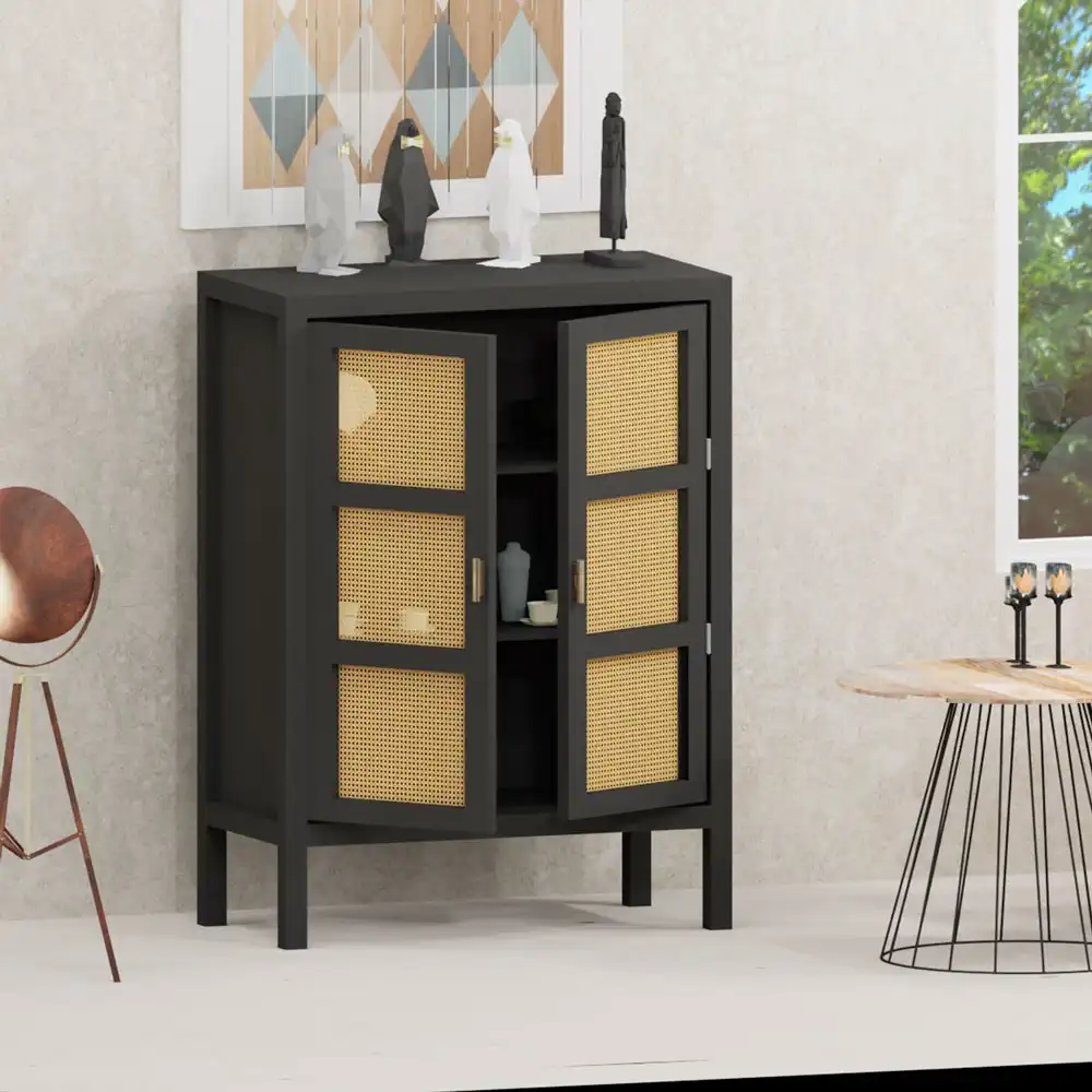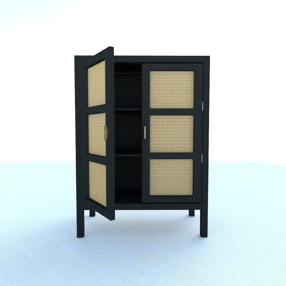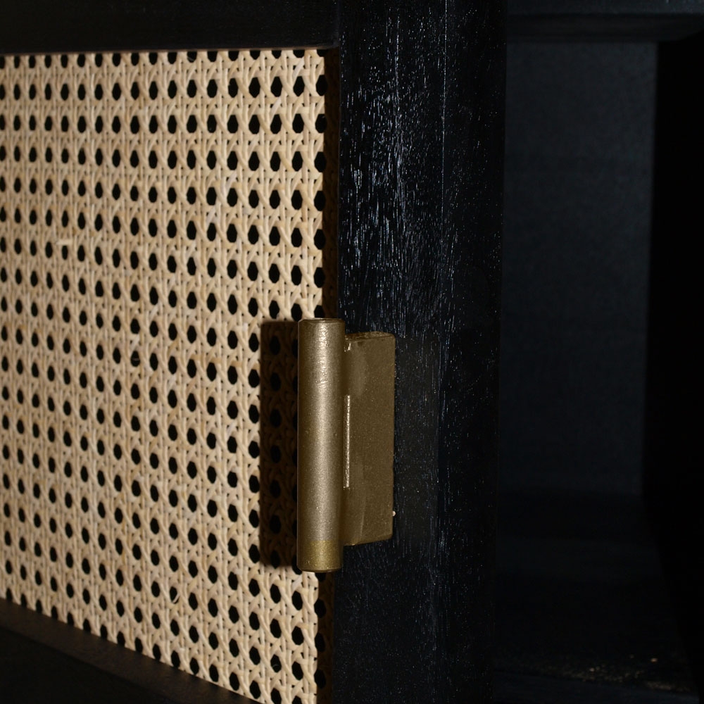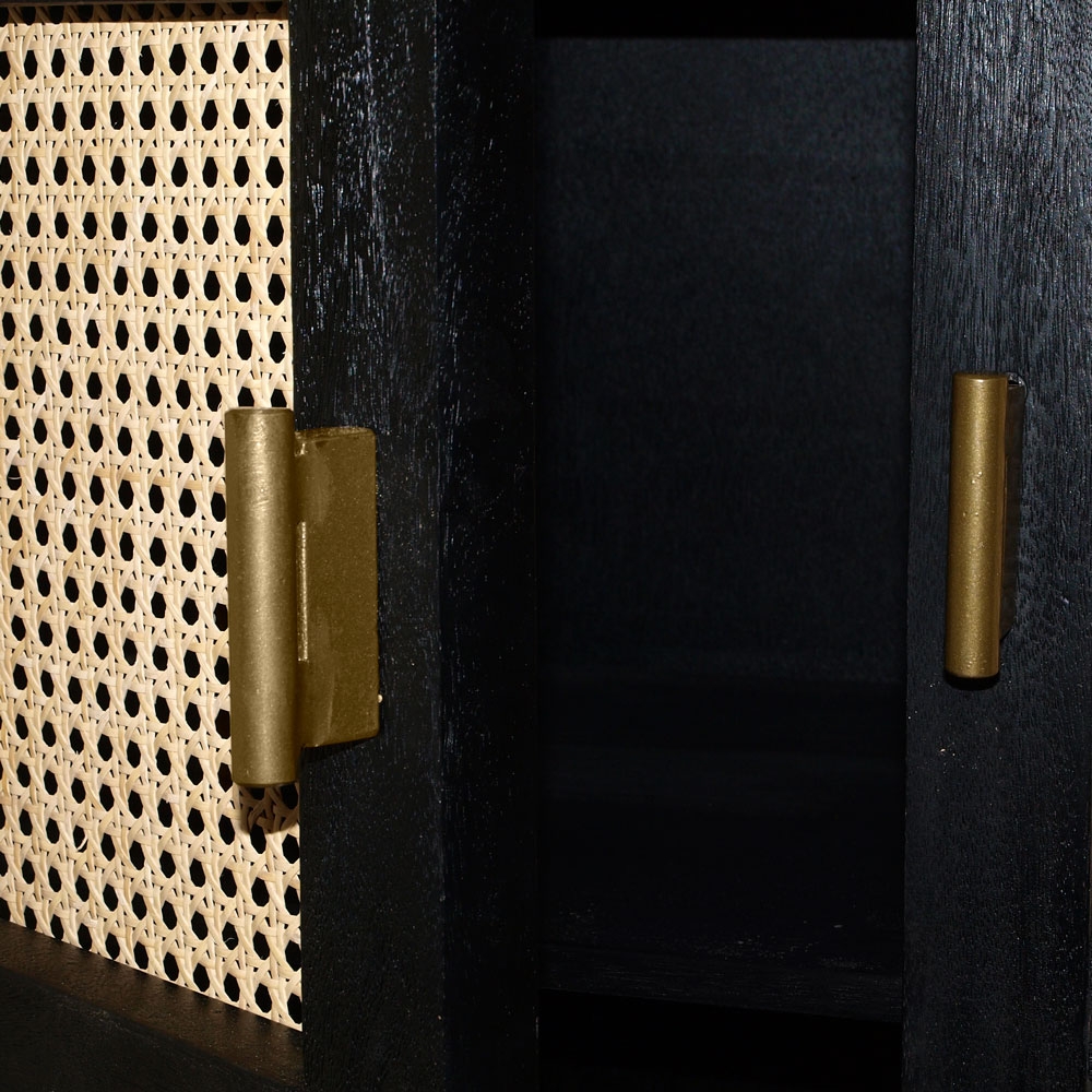 Aparador en madera maciza de mango y ratán en acabado negro con 2 puertas abatibles.
