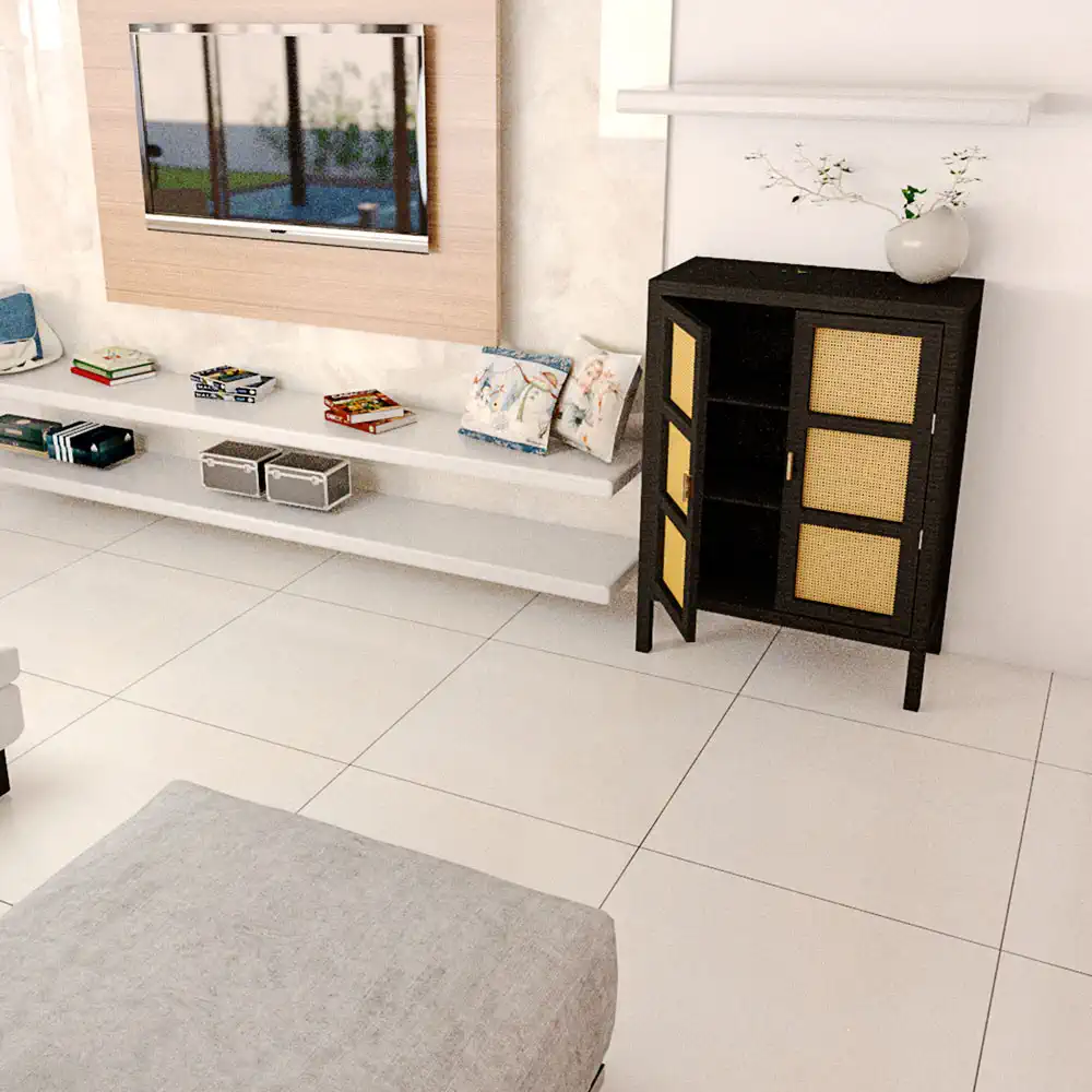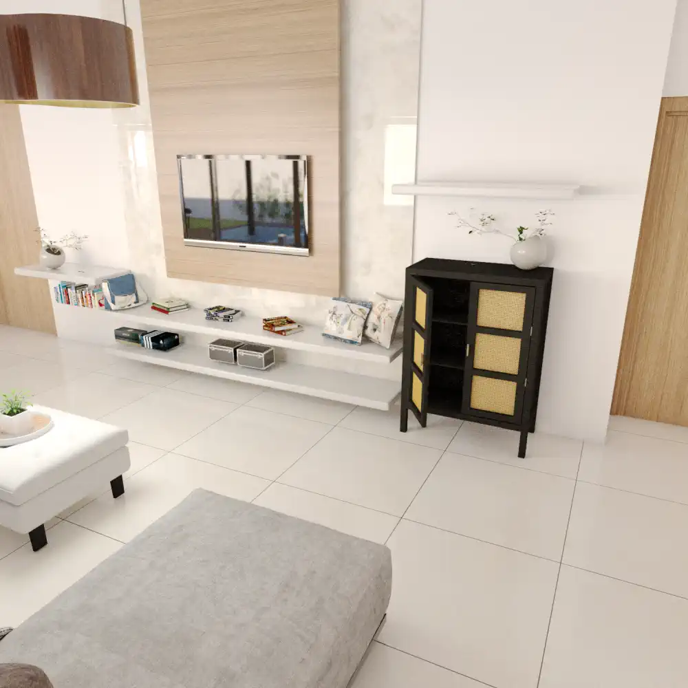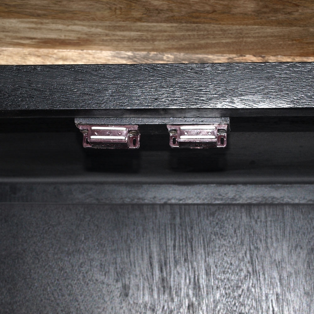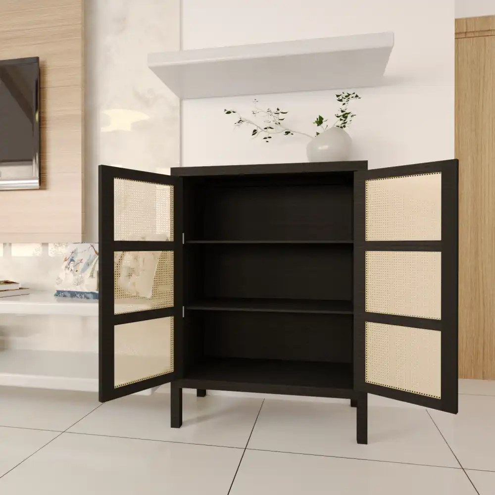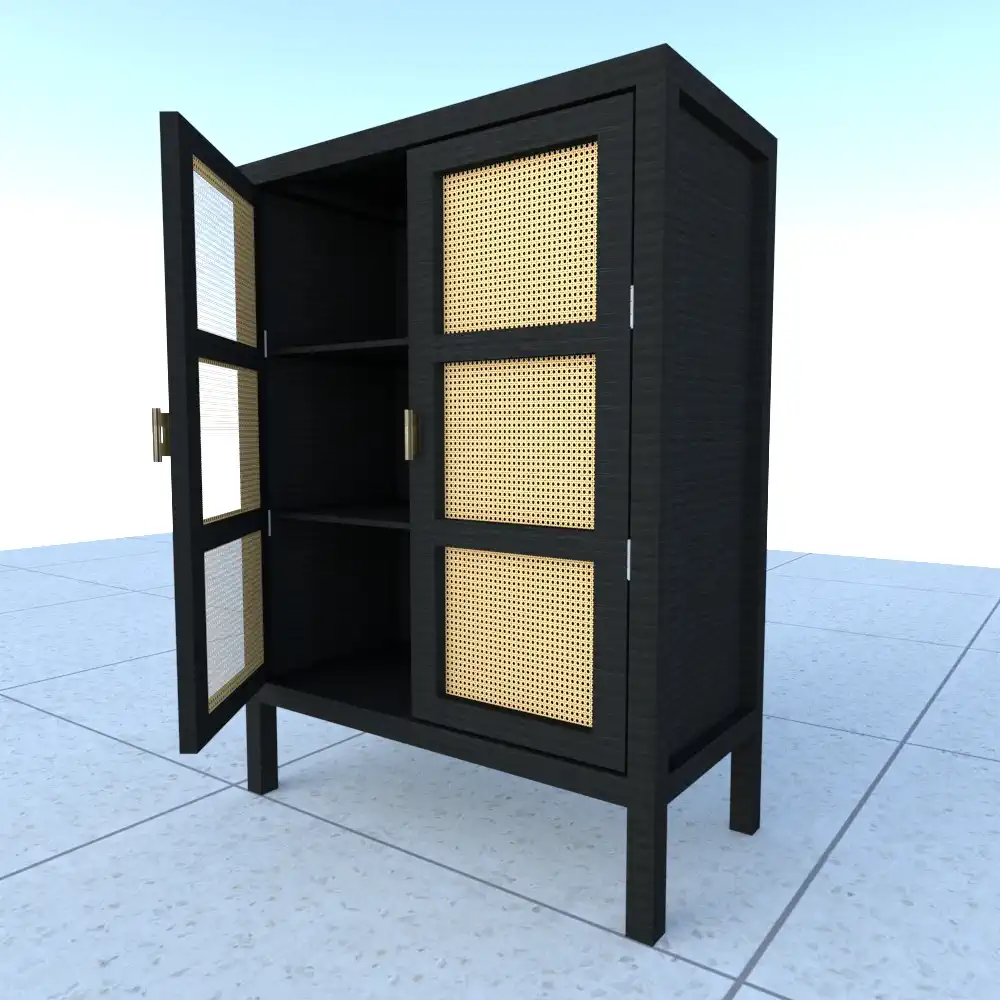 Aparador en madera maciza de mango y ratán en acabado negro con 2 puertas abatibles.
