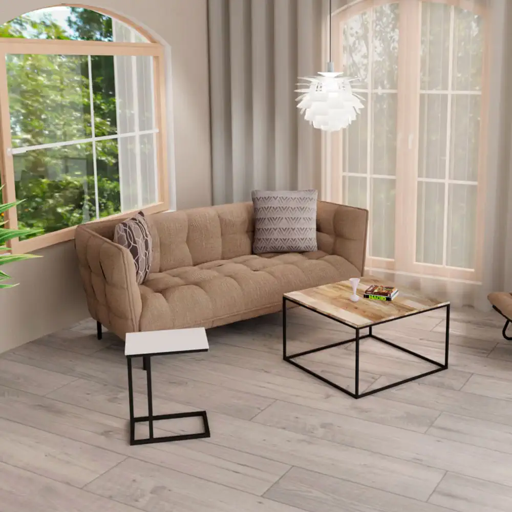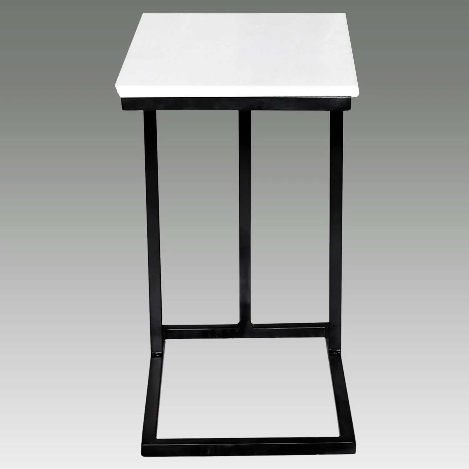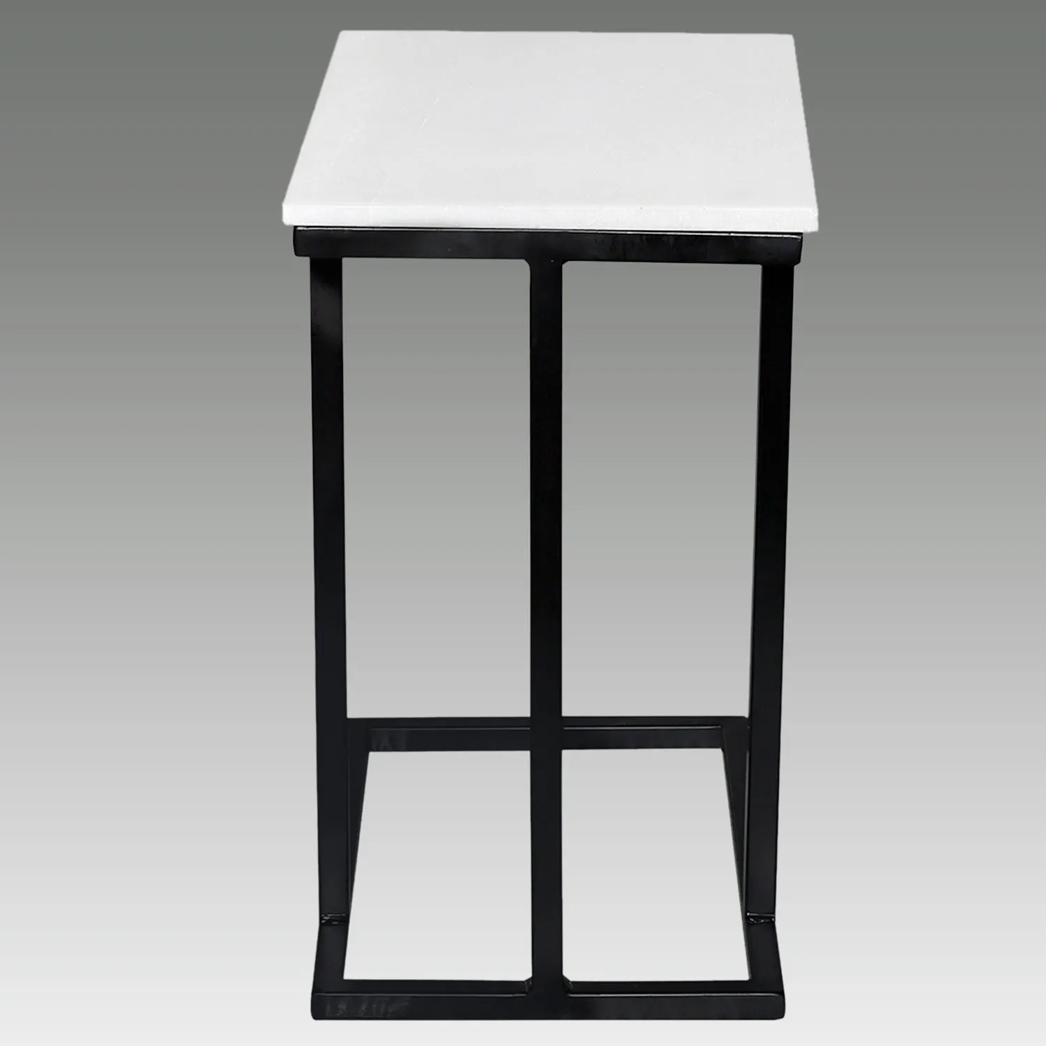 Preciosa mesita auxiliar compuesta de estructura en metal negro y tablero en mármol auténtico blanco