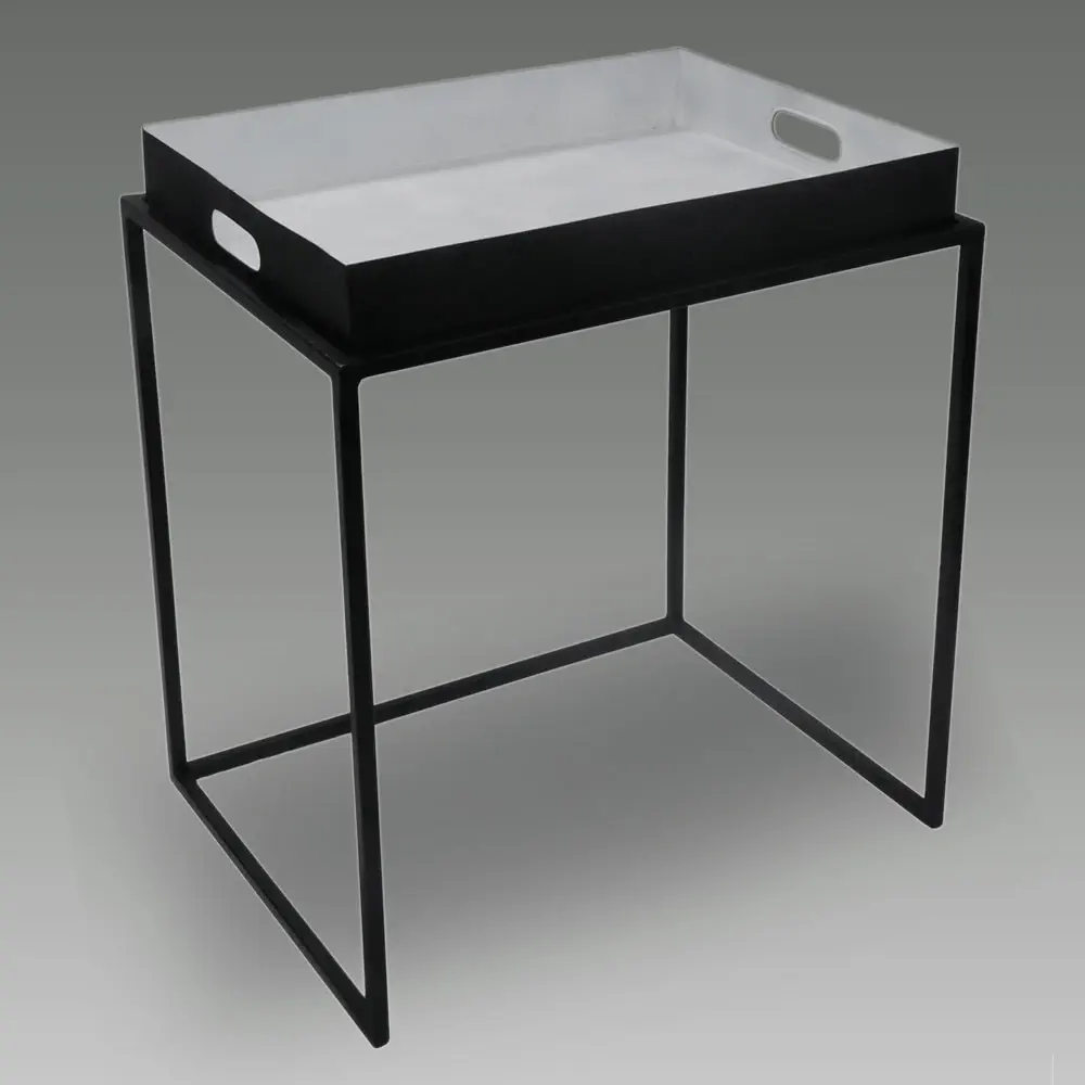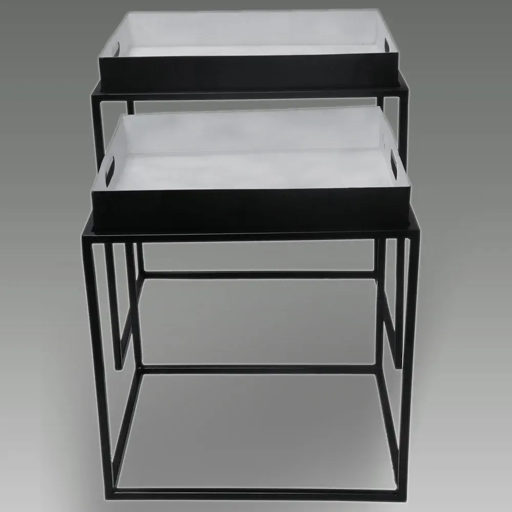 Mesitas auxiliares en 2 medidas modelo «dalas» con bandejas extraíbles en acabado negro y bandeja con fondo blanco.