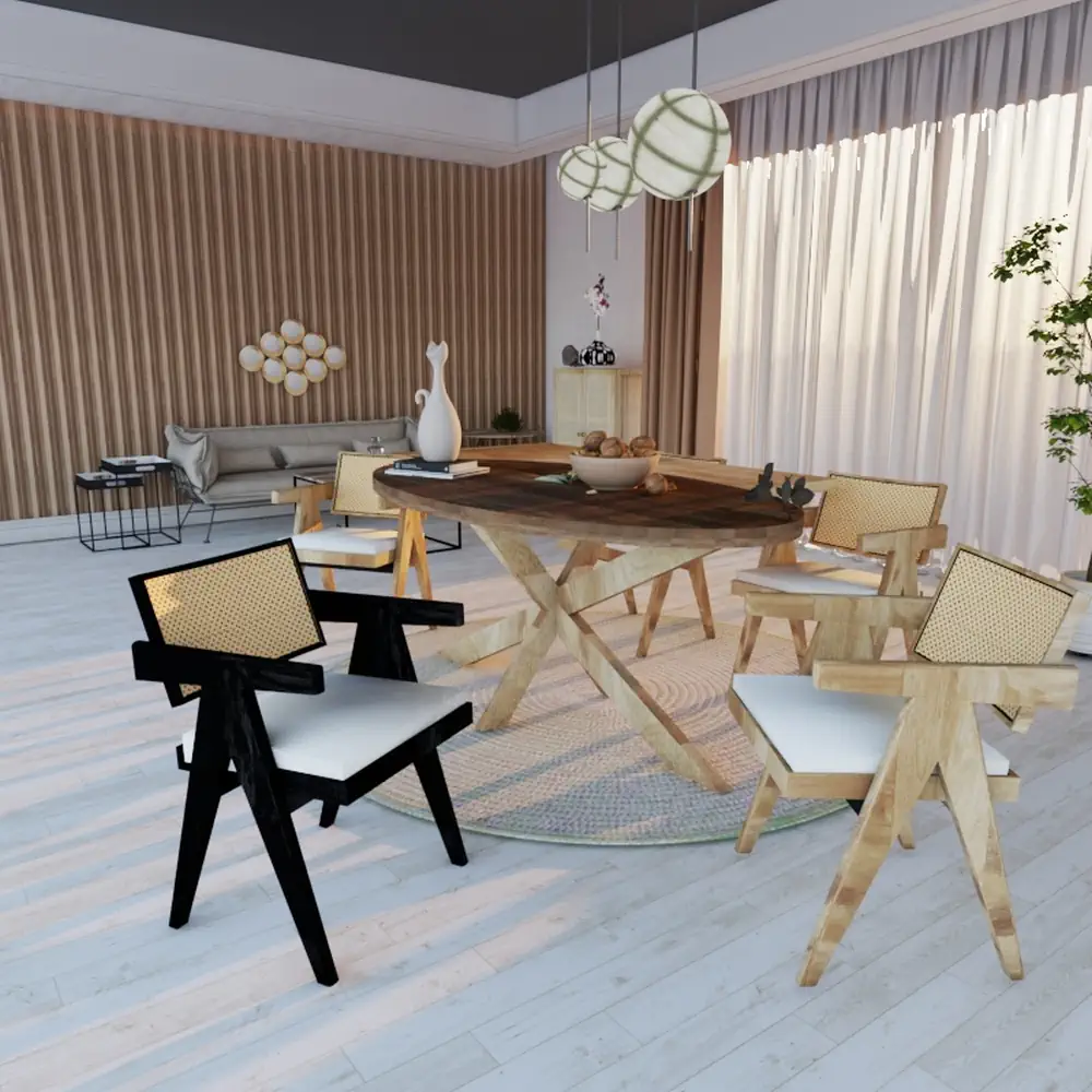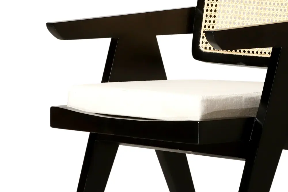 Silla en madera maciza de Mango modelo Greta acabada en negro, respaldo de ratán natural y asiento tapizado en color marfil.