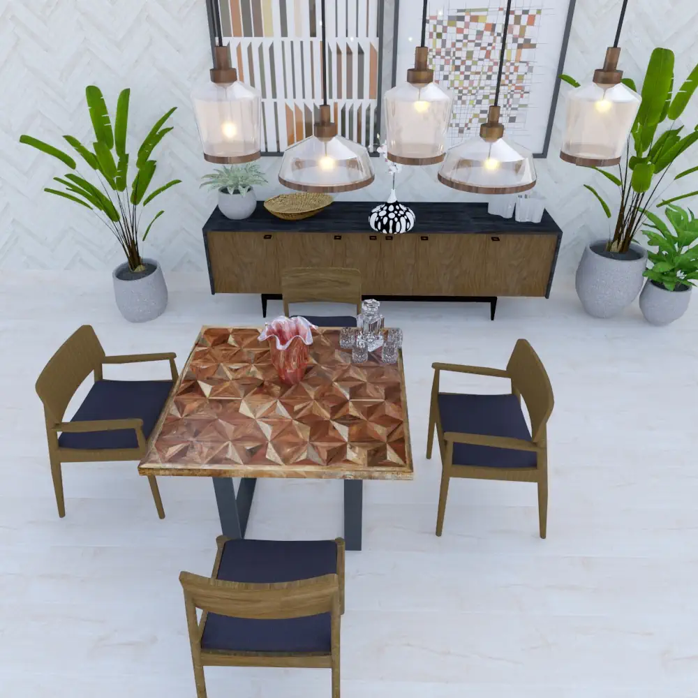 Sobre «Ches-Top» de mesa con dibujo geométrico de maderas recicladas de 100 x 100 x 4 sin patas.