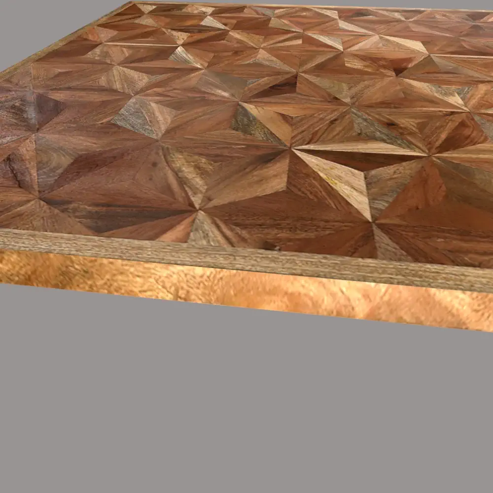 Sobre «Ches-Top» para mesa de salón realizado a base de diferentes maderas macizas naturales recicladas a modo de filigrana, creando un bonito dibujo geométrico como un tablero de ajedrez.