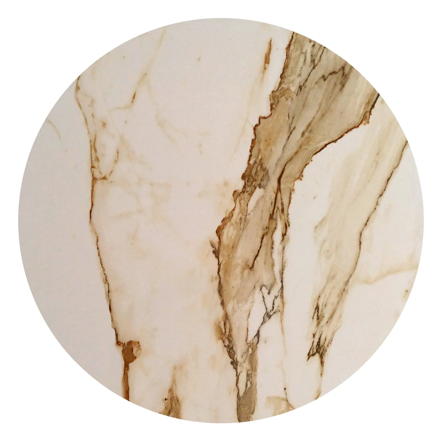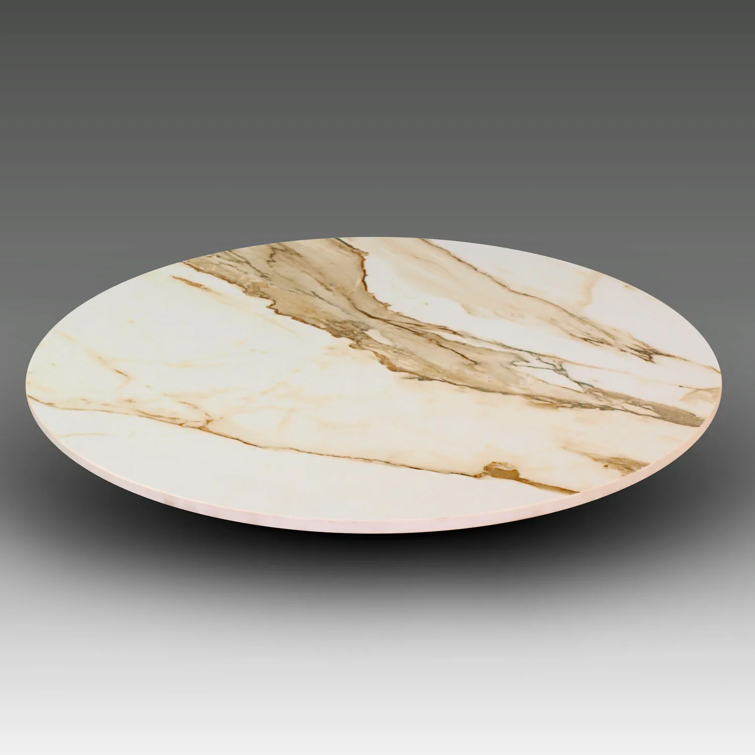 Sobre de piedra para mesa redonda modelo «Belly» para poner como tablero de mesa de centro de 60 cm Ø de diámetro. Gran dureza y resistencia a golpes y ralladuras. Acabado mármol, blanco con vetas colores ocre.